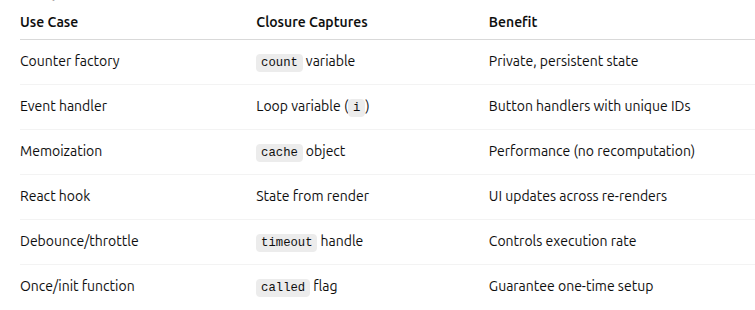 👉 Mental model: Think of closures like a backpack. When you define a function inside another, the inner function carries a backpack containing all the variables it references from its outer scope. Even if the outer scope is “gone,” the backpack keeps those variables alive.